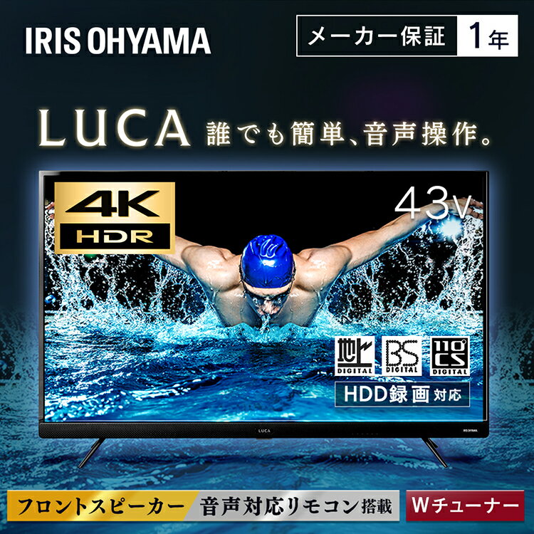 ■画面サイズ:43V型■商品サイズ(cm):幅約97.0×奥行約21.1×高さ約63.2■質量:約7.7kg■受信チャンネル地上デジタル:UHF(13〜62ch)、CATVパススルー対応BSデジタル:BS000〜BS999110度CSデジタル:CS000〜CS999■チューナー数:地上デジタル×2、BS・110度CSデジタル×2 ※1■画素数(水平×垂直):3840×2160■コントラスト比(標準値):1300:1■応答速度:9ms■視野角(最小値):左右約178°(TYP)/上下約178°(TYP)■スピーカー: 10W+10W■アンテナ端子:地上デジタル×1/BS・110度CSデジタル×1■AV入力:3.5mm4極ミニジャック(映像、左音声、右音声)■HDMI端子:HDMI(Ver.2.0標準規格)×3、ARC対応(HDMI3)■HDMI対応入力解像度:480i、480p、720/60p、1080/60i、1080/24P、1080/30P、1080/60P、4K 24Hz/30Hz/60Hz■音声出力:φ3.5mmステレオミニジャック×1、光デジタル音声出力×1■LAN:LAN端子×1 ※データ放送用■USB(録画専用):USB2.0端子×2■データ放送:双方向データ放送(Broadcast Markup Language)対応 ■番組表:電子番組表(EPG)対応:7チャンネル6時間分表示/8日分受信■電源電圧:AC100V 50/60Hz■定格消費電力:85W(待機電力0.5W)■年間消費電力量:130kWh/年 ※2■省エネ達成率:131%■動作確認済み外付けUSBハードディスクアイリスオーヤマ製:HD-IRシリーズエレコム社製:ELD-ERTUBKシリーズ/SGD-NXUシリーズ/ELD-QENUBKシリーズBUFFALO社製:HD-NRLCシリーズ■付属品:スタンド×2、スタンド固定用ねじ×4、電源コード×1、AV入力アダプター×1、リモコン×1、リモコン用単4形乾電池(テスト用)×2、miniB-CASカード×1枚、音声リモコン(電源アダプター)、USBケーブル(2m)、取り付けブラケット、取り付け用ビス※1 ダブルチューナーの1つは視聴専用チューナーのため、2番組同時録画には対応していません。