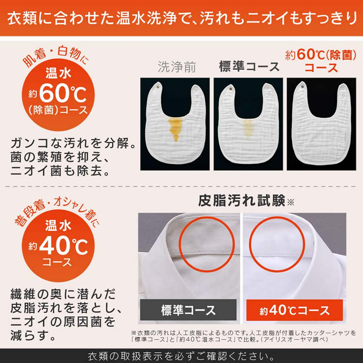 ■部屋干しコース衣類に合わせて約50℃・約40℃の温水で最終すすぎ。