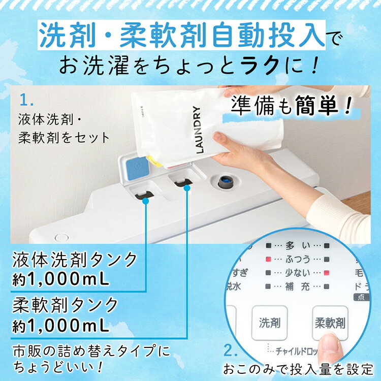 ◆うれしい機能・洗剤、柔軟剤自動投入機能洗濯のたびに使用する水の量に合わせて、自動的に液体洗剤・柔軟剤を投入します。